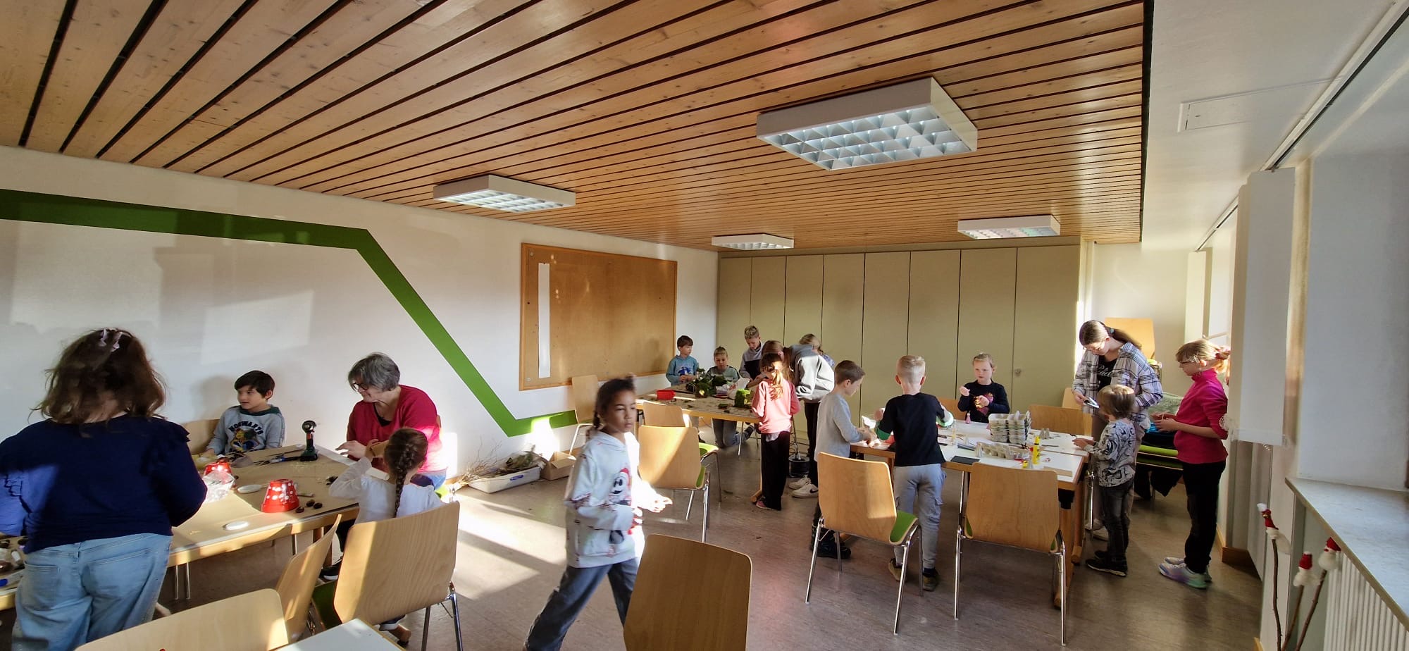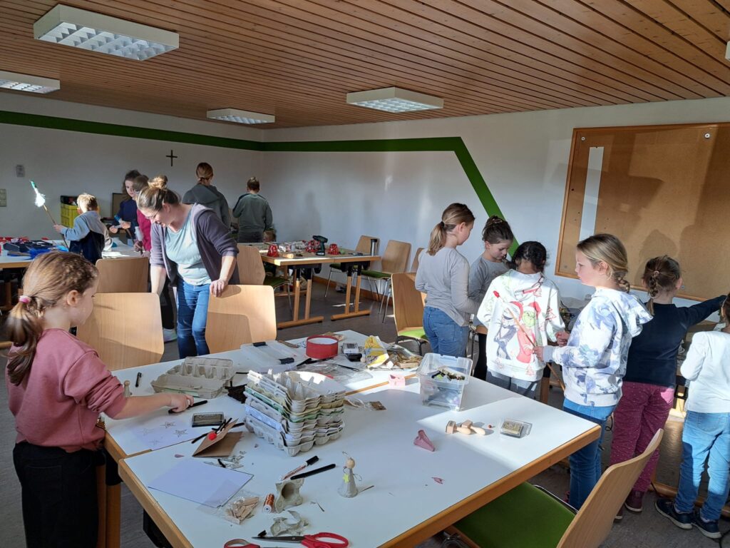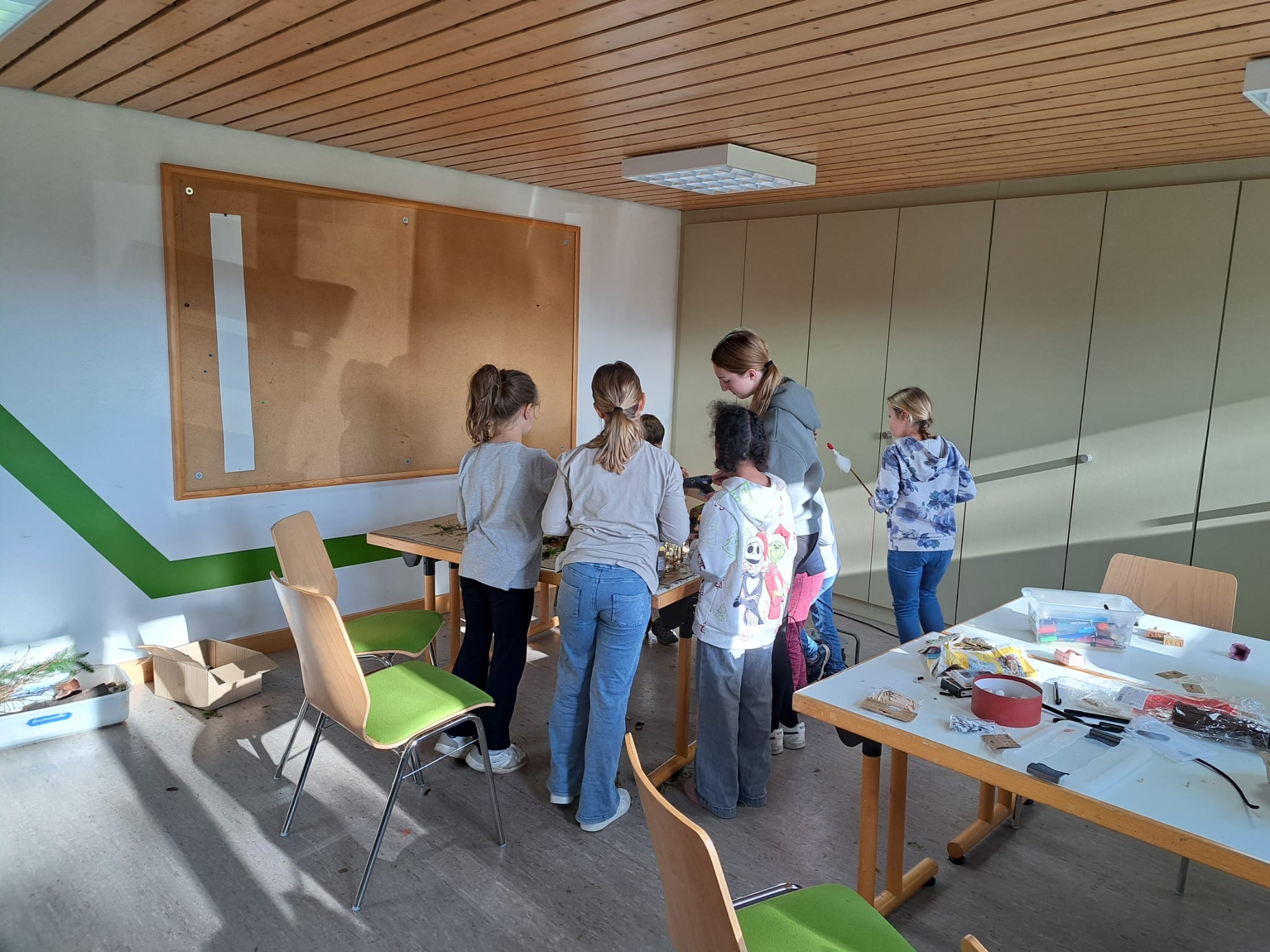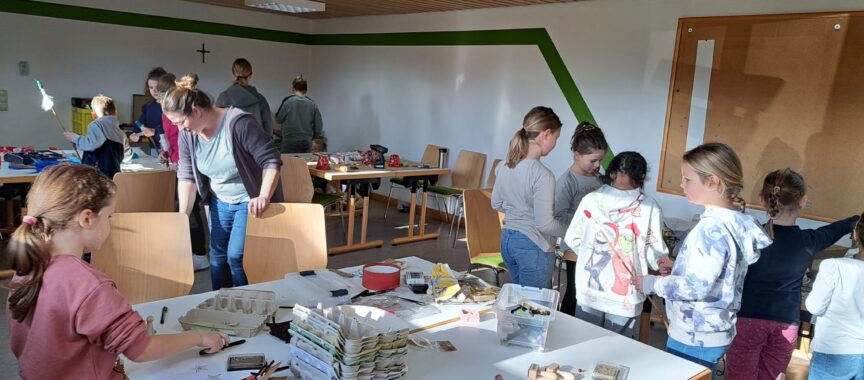 Am Buß- und Bettag trafen sich rund 18 Kinder im Gemeindehaus und bastelten für den Advent – Unterstützung erhielten sie hier ganz besonders von Sarah und Anna: