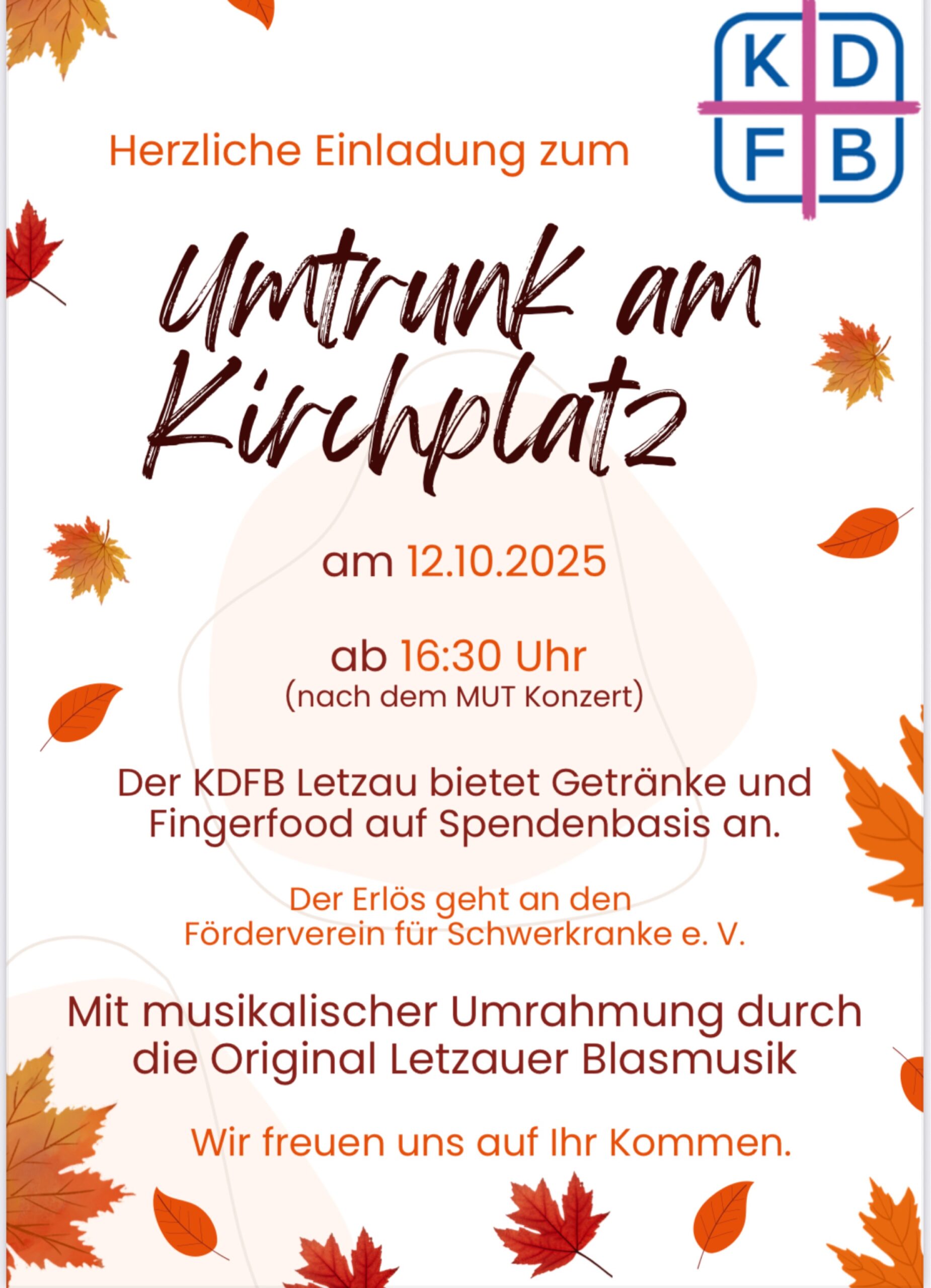 um 15:30 Uhr in der kath. Expositurkirche St. Johannes Nepomuk Letzau – anschl. Umtrunk auf dem Kirchplatz durch den KDFB Letzau: