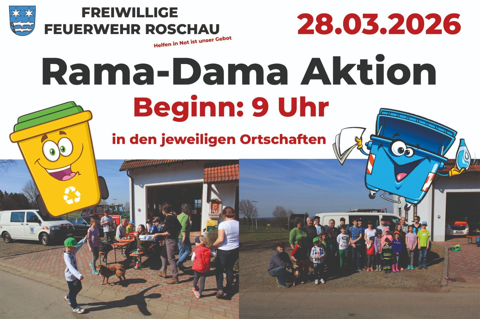 Wir beteiligen uns auch in diesem Jahr wieder an der Rama-Dama Aktion des Landkreises Neustadt. Beginn ist um 9:00 Uhr in den Ortsteilen Görnitz, Hammerharlesberg und Roschau. Anschließend treffen sich alle Teilnehmer am Feuerwehrhaus in Roschau.